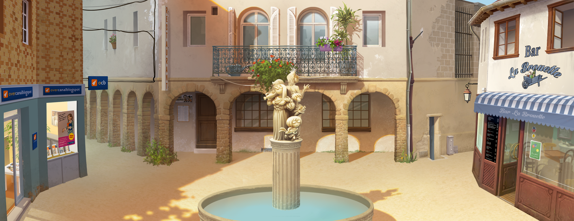 Un décor du jeu. Une petite place, avec une fontaine au centre.