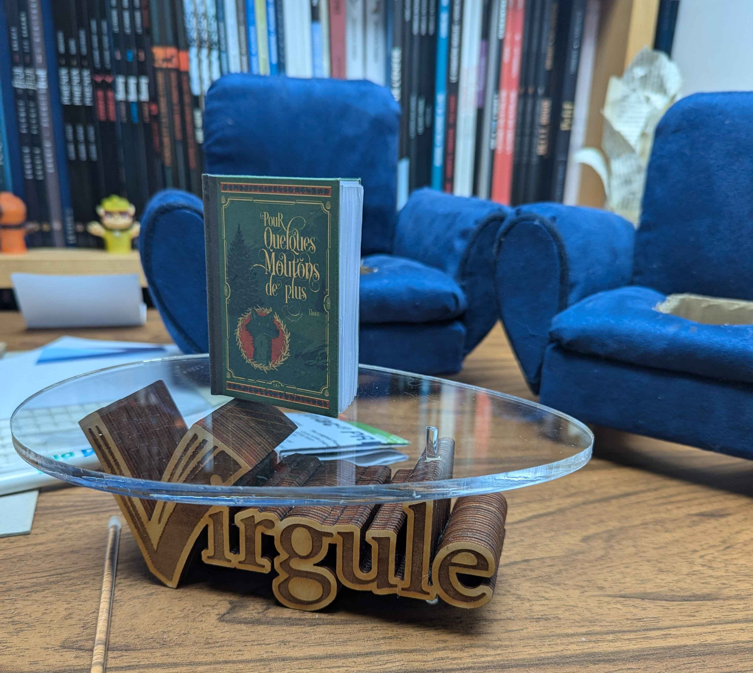 Deux fauteuils miniatures, avec un trou au niveau de l’assise, et devant, une table basse avec un plateau transparent, et une base en bois marquée “virgule”. Sur la table, un livre “Pour Quelques Moutons de Plus”