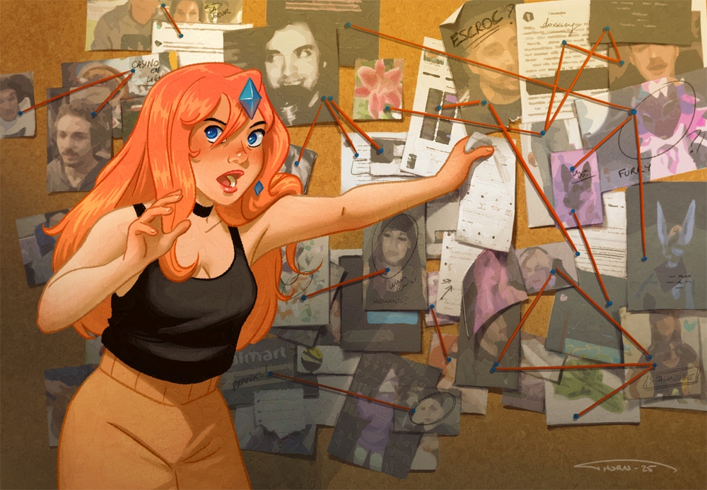 Cléore devant un tableau de détective, avec plein de photos, de documents, et des fils rouges partout.